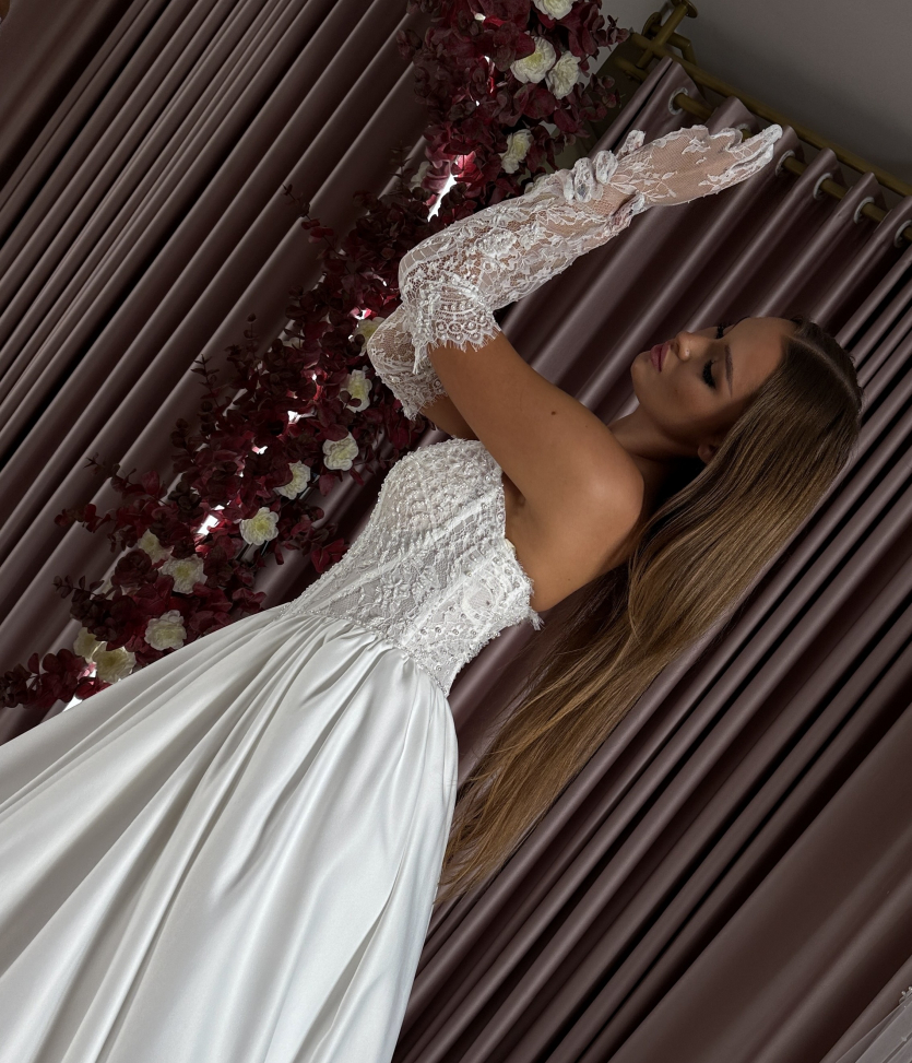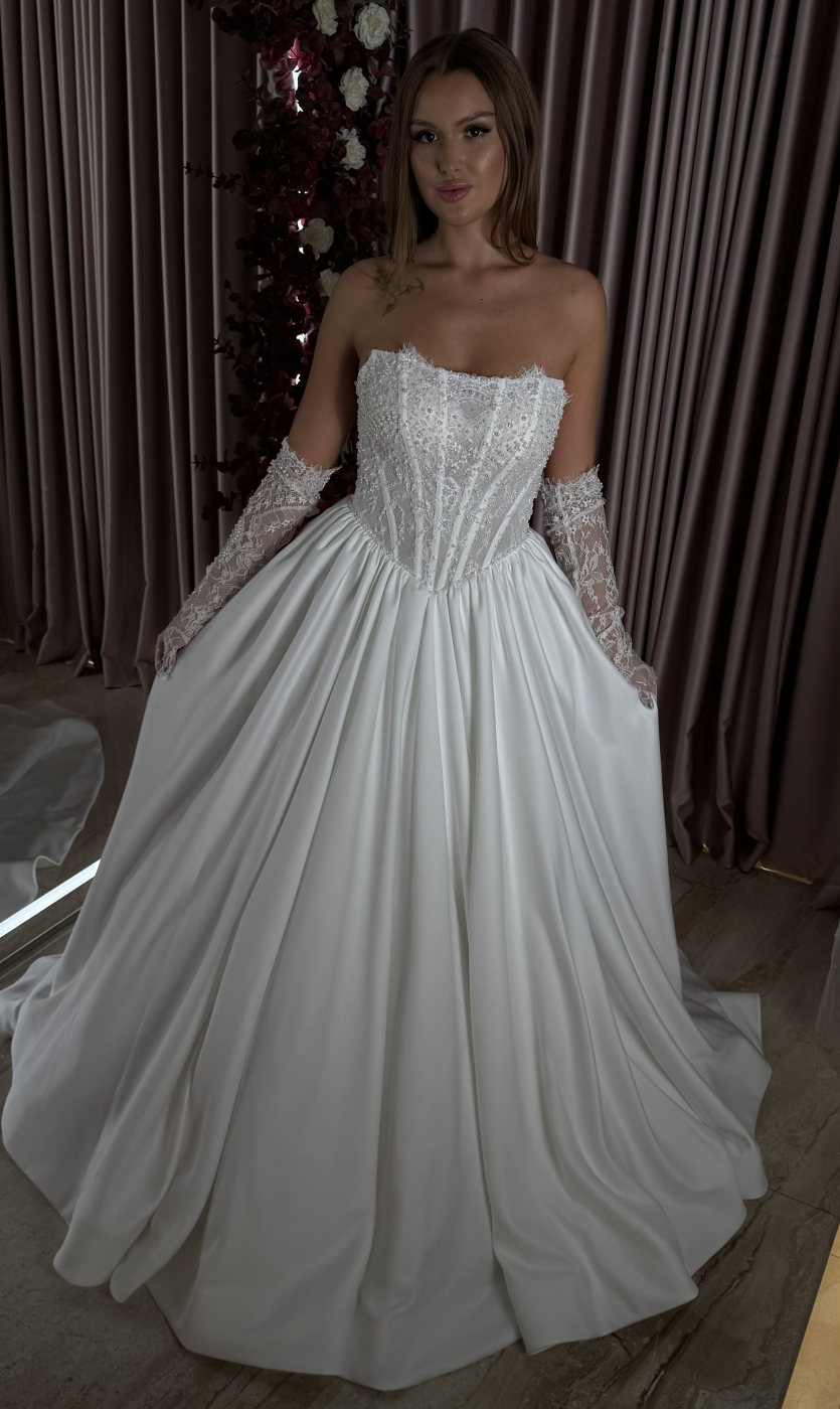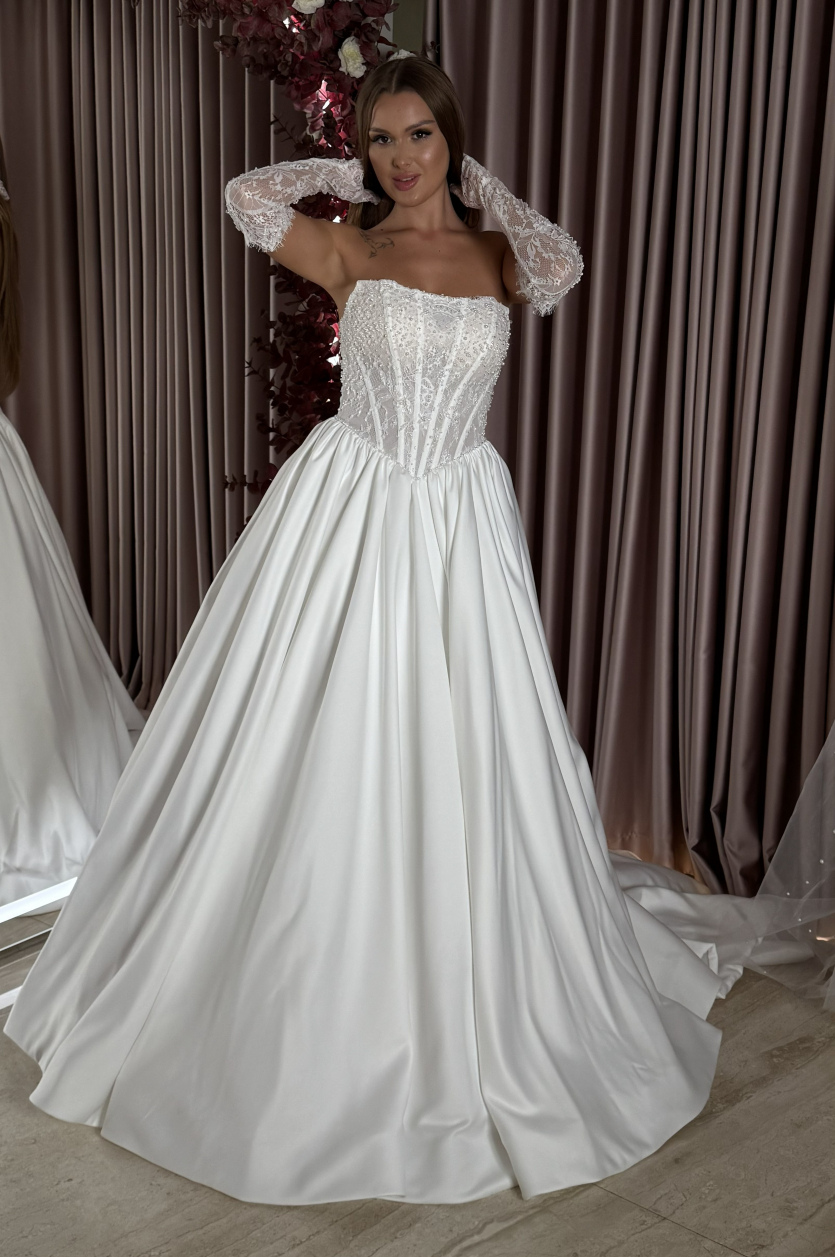 Rochie de mireasă cu corset fără bretele și fustă amplă din satin. Partea superioară este decorată cu dantelă și mărgele fine, evidențiind silueta grațioasă. Mâneci detașabile din dantelă adaugă un aer romantic și delicat întregii ținute.